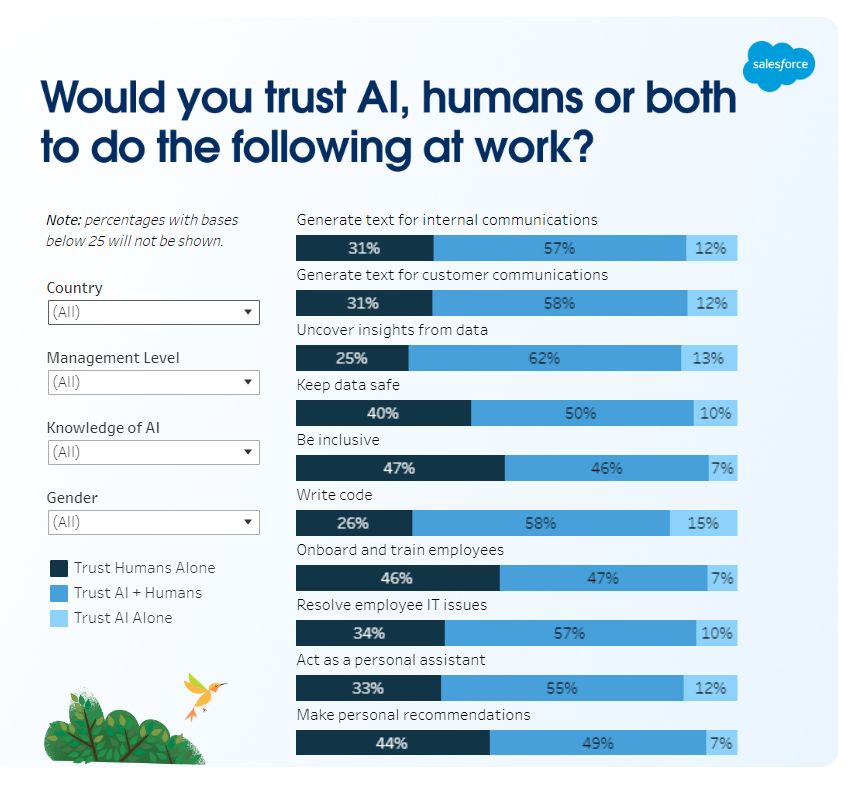 Пола Голдман, руководитель отдела этики и гуманного использования Salesforce, говорит, что, помимо ажиотажа вокруг ИИ, работники уже начинают видеть его преимущества: «Они уже доверяют ИИ почти половину своих рабочих задач — и они начинают видеть будущее, в котором ИИ изменит их работу к лучшему».