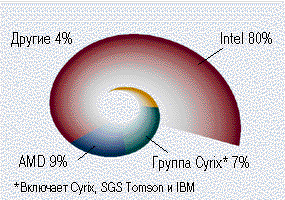 На сегодняшний день AMD расходует 10 млн. долл. на возмещение ущерба, нанесенного серьезными задержками выпуска продукции в прошлом году, а ее конкурент Cyrix (Ричардсон, шт.Техас) планирует занять существенную долю рынка со своим ПК, представленным в начале апреля. Intel в это время расширяет успешную кампанию “Intel Inside”, переходя от маркетинга продукта к созданию корпоративного образа.