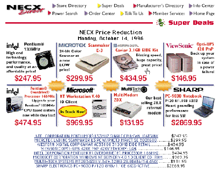 Узел NECX Direct содержит отдельные страницы для каждого из 20 тысяч компонентов. Технически он размещен на двух SPARC-серверах фирмы Sun Microsystems, работающих под управлением ОС Solaris, на которых установлено ПО Commerce Server корпорации Netscape Communications.