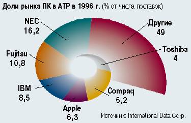 Словно упрямый подросток, рынок Азиатско-Тихоокеанского региона (АТР) отказывается слушаться своего "большого папочку". И это после пяти лет "пота и крови" - инвестиций более чем в миллиард долларов. В результате всего Compaq занимает лишь пятую позицию по количеству продаж и имеет всего 5,2% рынка, уступая NEC, Fujitsu, IBM и Apple. Хуже того, прошлый год принес корпорации некоторое снижение стоимости акций.