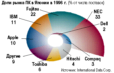 Флагманом политики Compaq на рынке Японии являются серверы. Но и здесь не обошлось без неудач. По оценкам IDC, в 1996 году Compaq уступила первое место на этом рынке компании NEC, опустившись сразу до третьей позиции. Нагойоши Накано, аналитик из Dataquest Japan, считает, что, когда дело доходит до торговли с корпорациями, крупные японские производители имеют заметное преимущество перед Compaq. "Японские покупатели уже работают с мэйнфреймами Fujitsu и Hitachi, и их связь с этими производителями значительно крепче, чем с Compaq", - объясняет он.