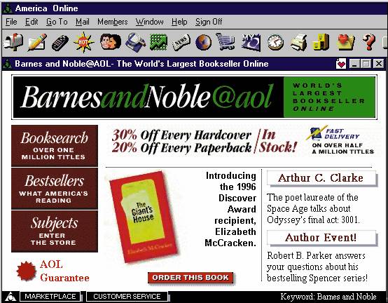 Понаблюдав за восходящей звездой Amazon.com, освоившей продажу книг исключительно через Web и занимающей в настоящее время место бесспорного лидера онлайновой книготорговли, Barnes & Noble, этот основной магазин дисконтной торговли книгами в США понял, что рискует проиграть в конкурентной борьбе, если будет просто сидеть в глухой защите. Договор же с AOL открывает продавцу книг прямую дорожку в Internet. Кроме того, у каждой компании имеется одинаково привлекательное “приданое”: со стороны Barnes & Noble - весьма уважаемое имя и многолетний опыт торговли книгами, со стороны AOL - восьмимиллионная база подписчиков.