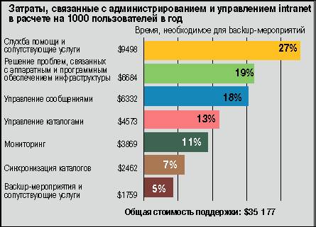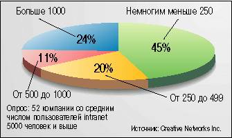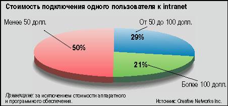 Intranet-системы растут на глазах. В среднем, по данным cni, компании рассчитывают в текущем году увеличить количество пользователей intranet на 110%. Такая скорость роста не будет бесплатной, учитывая, что усредненная стоимость установки каждого Web-сервера достигает 109 тыс. долл. (включая затраты на аппаратную часть, ПО и преобразование данных). В проведенных исследованиях было установлено, что затраты компании на аппаратное и программное обеспечение, необходимые для подключения к intranet, достигают в среднем 302 долл. на каждого пользователя (помимо затрат на пользовательские рабочие станции).
