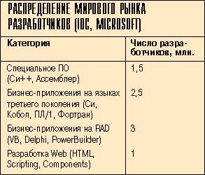 Хотя доля программистов среди компьютерных пользователей уменьшается, но в абсолютном выражении их число в мире продолжает расти (в России мы наблюдаем противоположную картину). По данным исследовательской компании Market Decisions, сейчас в мире насчитывается 5,6 млн. профессиональных разработчиков, в том числе 2,4 млн. в США. (В начале 90-х годов оценки числа программистов не выходили за пределы 2 - 3 млн. человек.) По данным IDC, программистов в мире еще больше - 8 млн. Возможно, эти расхождения в оценках вызваны тем, что IDC подсчитывала число пользователей отдельных инструментов, а один разработчик использует, как правило, более одного пакета.