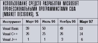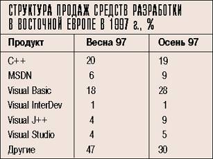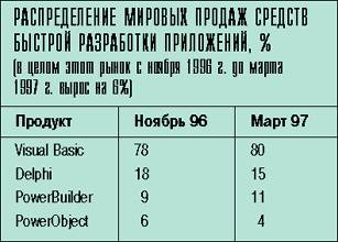 Парадоксально, но тем самым было еще раз продемонстрировано, что продвижение инструментальных средств в нашей стране пока еще не входит в число приоритетных направлений работы корпорации. Ведь основная версия VB 5.0 появилась еще в марте 1997 г., а ее локализованный вариант поступил в Москве в продажу в сентябре. Причем все эти события уже освещались в компьютерной прессе. Поэтому сейчас, наверное, наибольший интерес представляют последние статистические данные, свидетельствующие об успехе продвижения VB. Они были приведены в докладе специалиста по средствам разработки Microsoft ОА Юрия Томашко.