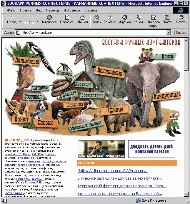 C 17 июля по 18 августа на сайте “Зоопарк ручных компьютеров” (www.handy.ru), одним из спонсоров которого является компания “Электон” (www.electon.ru), проводится месячник фирмы “Парагон” (Paragon Software, http://russia.penreader.com), занимающейся разработкой ПО для карманных и ручных компьютеров (в дальнейшем - КПК). В эти дни в “Зоопарке” будет размещен каталог программ Paragon Software с адресами демоверсий. Кроме того, на сайте будет представлена информация о новых продуктах компании и о планируемых ею разработках. Во время акции специалисты “Парагона” намерены оперативно отвечать посетителям “Зоопарка” на наболевшие вопросы, а также, в порядке “ответного наезда”, рассказывать о том, что наболело у них.