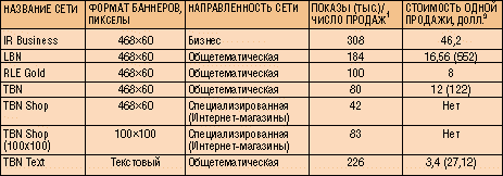 Таргетирование рекламы во время проведения кампании не осуществлялось, количество показанных объявлений было примерно одинаковым для каждого баннерообменника. Засчитывались и повторные посещения: покупка добавлялась в актив той сети, из которой человек заходил на сайт в последний раз. Сами рекламные объявления были максимально честными: Web-серферу сообщалось, куда он попадет при нажатии мыши, никаких “художественных” приемов по повышению эффективности баннеров вроде картинок с голыми девицами или чрезмерного мерцания в дизайне не применялось. Результаты эксперимента сведены в таблицу.