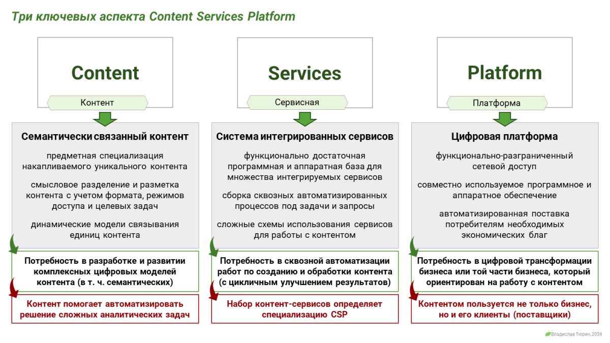 Если всё-таки относить CSP к цифровым платформам, то в её отношении справедливы и применимы три ключевых аспекта, определяющих концептуальную аналитику, задачу на проектирование, создание и использование такого типа систем. Причем эти аспекты непосредственно связаны с контентом — главным ресурсом и целевым предметом сервисных сделок.