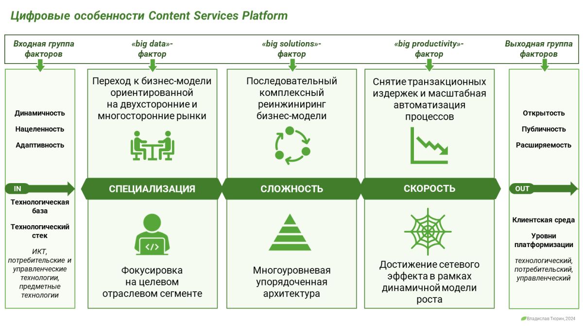Цифровая платформа сервисов управления контентом — это система, которая осуществляет поставку потребителям необходимых им экономических благ в автоматизированном или полностью автоматическом режиме. Что делает её виртуальным агентом, способным вступать в экономически значимое взаимодействие и поставлять клиентам в рамках сервисных сделок результат обработки контента. Существенно увеличиваются возможности функционального развития, расширяется масштаб операций, усиливается потенциал специализации, формируются соответствующие коммерческие и архитектурные риски. По ряду показателей и для многих рынков становится объективно обоснованным и экономически оправданным полноценный переход от обособленных корпоративных автоматизированных систем управления контентом к платформенным решениям. Они быстро и опираясь на практический результат расширяют и специализируют функционал, с учетом особенностей контента, задач клиентов и применяемых инновационных технологий.
