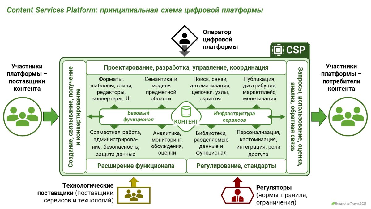 Вдобавок учтем в качестве примеров активно действующие на рынках цифровые платформы, которые с успехом управляют различным специализированным контентом. Также примем во внимание мотивацию и ожидания клиентов и поставщиков рынка решений по автоматизации процессов управления контентом. И не забудем общий контекст экосистемного развития цифровой экономики, в рамках которого актуализирована концепция контент-сервисных платформ. Все это позволяет сделать вывод о том, что CSP вполне может рассматриваться как цифровая платформа, т. е. как информационная система, предназначенная для автоматизированного или автоматического предоставления потребителям необходимых экономических благ (поставки товаров или оказания услуг).