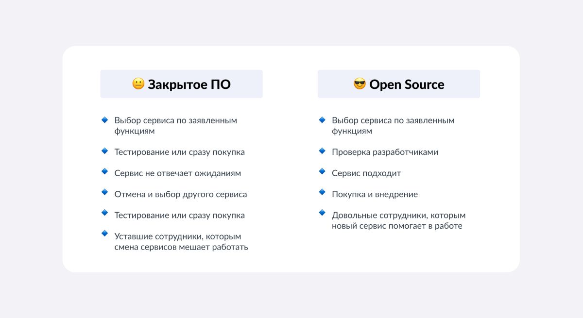 - Можно доработать сервис под себя. Open Source-продукты можно развивать и модернизировать независимо от вендора — это касается даже строгих лицензий.