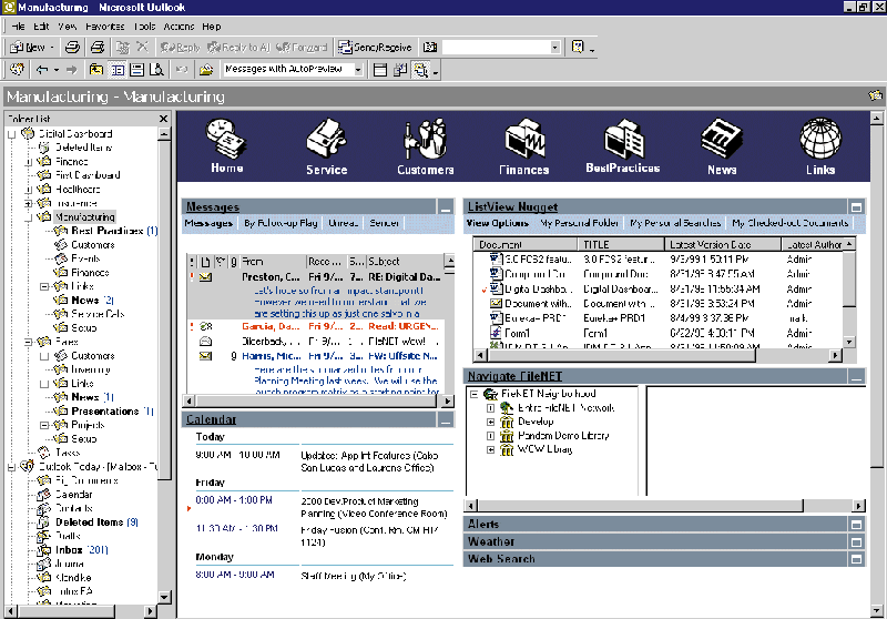 Интегрированное рабочее окно, которому FileNet дала название Panagon Dashboard, позволит просматривать (в том числе и совместно) документы непосредственно из Outlook. Благодаря этому под рукой пользователя постоянно будут находиться средства электронной почты, календарь, папки контактов и перечень текущих задач. Это стало возможным благодаря инициативе Microsoft (Редмонд, шт. Вашингтон), которая предложила технологию интеграции своих приложений с продуктами независимых производителей, опирающуюся на так называемые “крупицы” (nuggets). Эти переходные элементы - не что иное, как интерфейсы прикладного программирования, позволяющие запускать приложения из окна Outlook.
