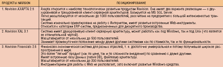 В новой версии предусмотрены развитые средства работы с Web и с мобильными устройствами, в частности, работа с системой Axapta через мобильный телефон (используя WAP-протокол) демонстрировалась в отеле неоднократно. А представление о ее позиционировании и технологических отличиях от других продуктов Navision можно составить по информации, приведенной в таблице.