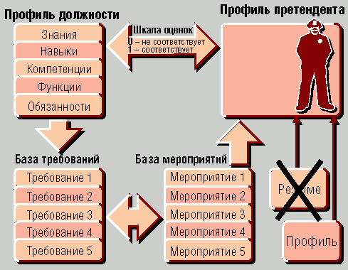 На основании разработанных профилей можно проводить и оценку персонала. В том случае, если показатели работника ниже, чем приведенные в профиле занимаемой им должности, сотруднику рекомендуется пройти обучение, причем система будет автоматически предлагать перечень необходимых мероприятий. Если же обнаруживается превышение показателей, заложенных в профиле занимаемой должности, то может быть принято решение и о включении сотрудника в кадровый резерв. Отсюда можно выйти на планирование карьеры.