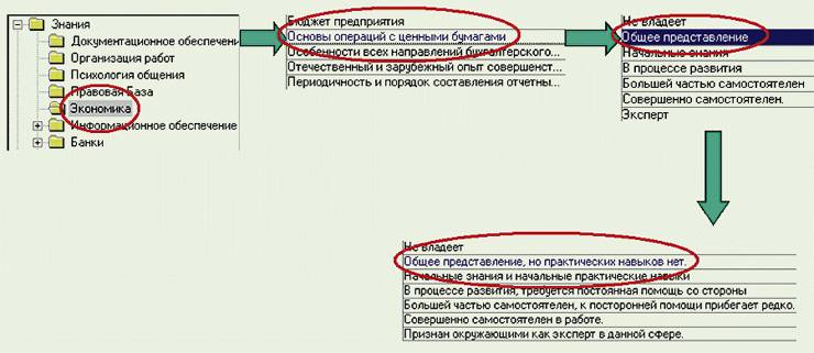 Механизм, который “АйТи” предлагает использовать в случае составления критериев оценки ПД и профиля работника, достаточно прост (рис. 2). Предположим, в профиле должности есть раздел “Экономика”, который расшифровывается в базе требований. Среди прочих в него включены конкретные требования по работе с ценными бумагами. Каждого работника можно оценить по шкале (в данном случае мы использовали семибалльную шкалу). Как видно из рисунка, пользователь имеет только общее представление о предмете. Расшифровка шкалы позволяет сделать однозначные выводы о соответствии сотрудника предъявляемым требованиям.