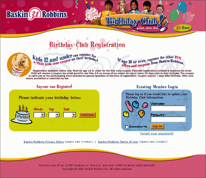 Этой весной Baskin-Robbins возобновила программу Birthday Club уже в онлайновой форме на базе своего Web-сайта. И только за апрель, по словам представителей компании, на нем побывал миллион посетителей.