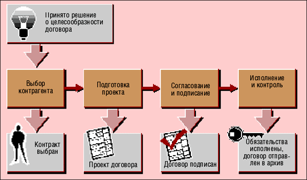 Зачастую термином “договорная работа” обозначают собственно заключение договора. Более правильно комплексное понимание договорной работы как процесса, который начинается с момента принятия решения о целесообразности заключения договора и заканчивается передачей исполненного договора на хранение в архив (см. рис. 1).
