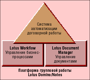 Другой подход состоит в реализации приложения для ведения договоров на основе платформы поддержки коллективной работы, разумеется, если в ней заложены возможности реализации workflow-систем. Этот подход также предполагает, что для контроля исполнения договоров подобная система должна быть интегрирована с финансовым модулем системы управления предприятием, в котором накапливаются финансовые данные по исполнению договоров. Такой подход может быть реализован, например, на решениях IBM Lotus (см. рис. 3).