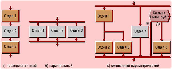 Все необходимые маршруты согласования будут реализованы, если система поддерживает не только последовательное и параллельное (одновременное) согласования, но также позволяет формировать смешанные маршруты согласования с передачей документа в то или иное подразделение по условиям (см. рис. 4).