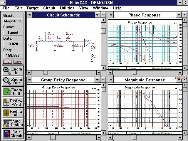 FilterCAD и Filter Wiz. Программы FilterCAD фирмы LinearX Systems (www.linearx.com) и Filter Wiz фирмы Active Filter Designer (www.schematica.com) предназначены для синтеза аналоговых активных RC-фильтров под управлением Windows. Они имеют современный интерфейс, и с ними работать гораздо удобнее, чем с Filter Design. Однако по функциональным возможностям все три программы примерно одинаковы (причем Filter Design обеспечивает синтез несколько большей номенклатуры фильтров). После ввода технического задания на создание фильтра синтезируется передаточная функция фильтра и рассчитываются нули и полюса в s-плоскости (в программе Filter Design при синтезе фильтров на переключаемых конденсаторах в z-плоскости). После выбора типовых звеньев (например, в FilterCAD имеется 140 вариантов звеньев 1 - 8 порядков, общее число звеньев не ограничивается) рассчитываются параметры их компонентов и чувствительность передаточных функций к их изменениям. Есть возможность переставлять звенья местами, округлять сопротивления резисторов и емкости конденсаторов с точностью 1, 5, 10 и 20% и непрерывно контролировать характеристики фильтра.