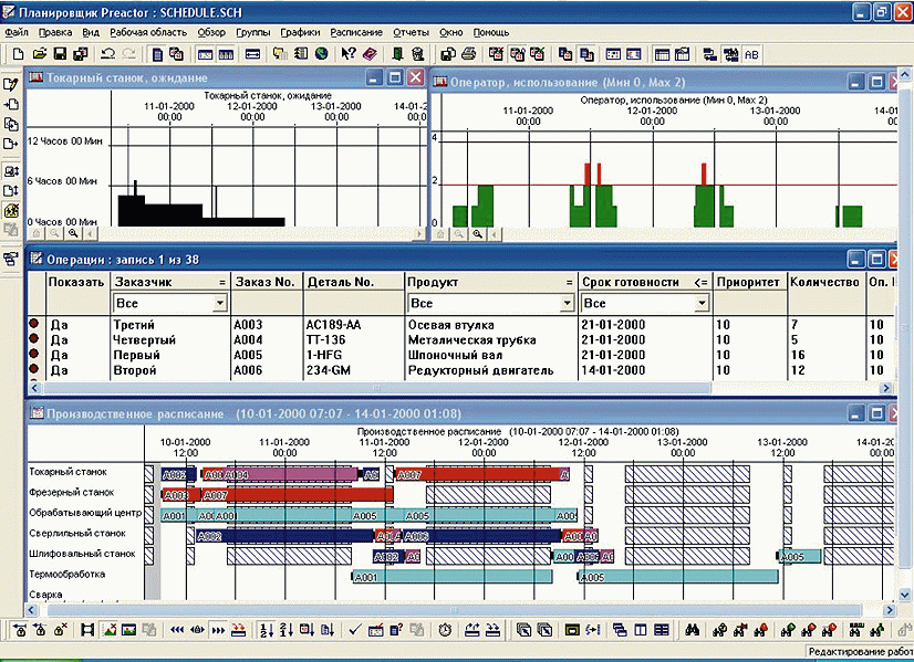 Оперативное перепланирование c учетом реального текущего состояния производства. Слабость большинства систем автоматизированного планирования (ERP, MRP) заключается в том, что ресурсы производства оцениваются ориентировочно либо вообще считаются неисчерпаемыми. Разбивая заказы на части и рассчитывая дату начала их изготовления, эти системы, увы, не учитывают доступность ресурсов в конкретный момент времени. Ведь абстрактное наличие ресурса вовсе не означает его доступность для выполнения каждого заказа в каждый момент времени. Таким образом, расписание, составленное без учета информации о фактическом состоянии ресурсов производства, не соответствует действительности и не может быть выполнено.
