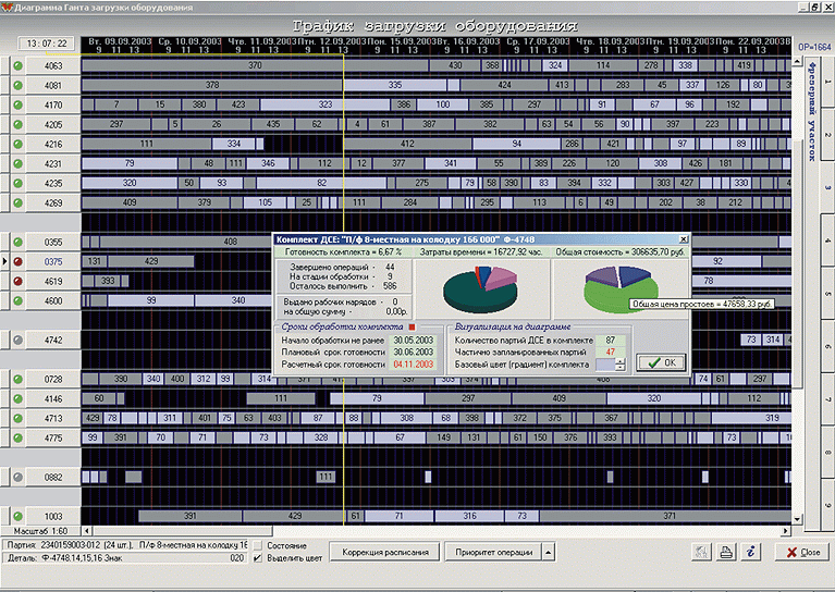 Для решения задачи оперативного планирования в MES-системах строится динамическая компьютерная модель производства. Она реализует непрерывное имитационное моделирование движения материальных потоков внутри цеха в соответствии с технологическими маршрутами. Производственное расписание наглядно описывается диаграммой Ганта, где каждой операции ставится в соответствие отрезок прямой, длина которого пропорциональна ее длительности. Эти отрезки, именуемые линиями Ганта, располагаются напротив инвентарных номеров основного технологического оборудования в последовательности, соответствующей расписанию. Встроенный механизм диспетчеризации производства обеспечивает своевременную доставку и ввод информации о совершаемых действиях, происходящих событиях и отклонениях от составленного оперативного плана. Производственное расписание поддерживается в оптимальном состоянии за счет непрерывной компенсации отклонений методом коррекции либо полного перерасчета. В результате все процессы, происходящие в цехе, становятся прозрачными, достигается "прозрачность", управляемость и идентифицируемость материальных потоков производства в соответствии с требованием международных стандартов (рис. 1 и рис. 2).