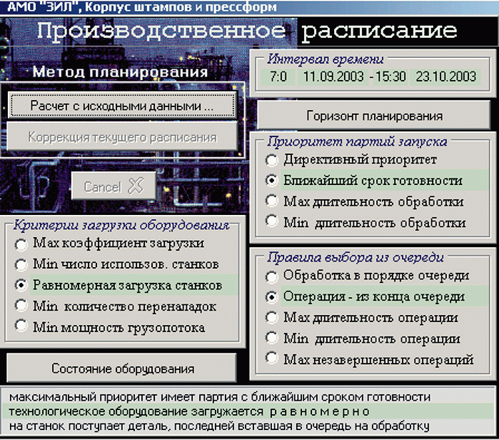 Оперативное планирование и диспетчеризация процессов. Для расчета производственного расписания на отечественных предприятиях либо используются статические инструменты, такие, как сетевые графики, бумажные таблицы, доски планирования, либо вообще никакие инструменты не применяются. События, вносящие существенные изменения в расписание, происходят столь часто и в таком количестве, что возможности статического инструмента, и тем более человека, не позволяют учитывать их в полном объеме и поддерживать расписание в оптимальном состоянии. В результате оперативный план, если таковой имеется, очень быстро перестает соответствовать действительности и теряет свою актуальность в среднем по истечении 20% планируемого периода. Уровень организации производства резко падает, снижается его рентабельность.
