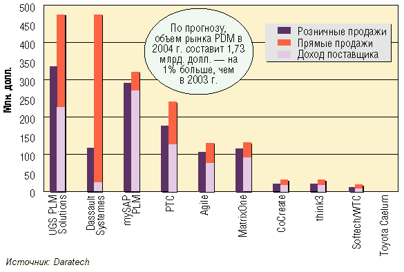 Предполагается, что первое место по доходу от продаж ПО и услуг в 2004 г. достанется компании UGS, продвигающей систему Teamcenter, второе - Dassault Systems с продуктами ENOVIA и Teamcenter, за ними будут следовать SAP с mySAP PLM и PTC с Windchill. Если считать по темпу роста, то места распределяются по-другому. Лидером станет компания think3 (60%), за которой будут располагаться Dassault (23%), MatrixOne (12%) и CoCreate (8%).
