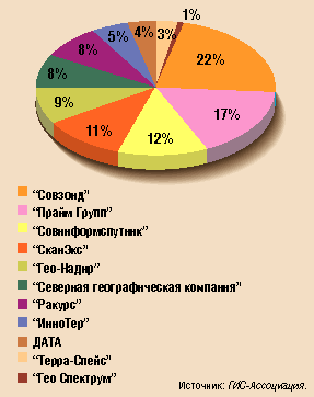 А пока жизнь берет свое. В 2004 г. на производство геопространственных данных было израсходовано около 680 млн. долл., из них доля госбюджетного финансирования составила всего 80 млн. долл. (см. рис. 1). На российском рынке сформировался устойчивый круг компаний - поставщиков данных ДЗЗ (см. рис. 2). Причем все они работают в основном на базе данных иностранных спутников, передающих снимки со средним разрешением (Landsat и ASTER), высоким (SPOT, IRS-1, RadarSat) и сверхвысоким (QuickBird, Orbview, EROS, KVR-1000, IKONOS). Лидерами здесь являются компании "Совзонд" и "Совинформспутник", которые были созданы с участием государственных структур, но теперь все более становятся чисто "рыночными" предприятиями.