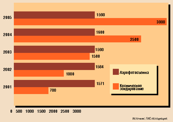 На их фоне частные фирмы НТЦ "СканЭкс", "Прайм Групп", "Гео-Надир" и другие смело развивают услуги по распространению и обработке ДЗЗ под задачи заказчиков. В связи с ростом доступности снимков ДЗЗ высокого разрешения (1 м и менее) в мире идет передел и развитие рынка кадастровых систем, база данных которых еще 10 лет тому назад почти целиком обеспечивалась аэрофотосъемкой. Сегодня доля аэрофотосъемки повсюду значительно уменьшилась, а ее объем в России сохраняется только благодаря неотрегулированному положению с законодательной, нормативной и правовой документацией. На рис. 3, взятом из доклада г-на Миллера, четко видно, что соотношение объемов использования материалов аэрофотосъемки и ДЗЗ в России изменилось в пользу ДЗЗ.