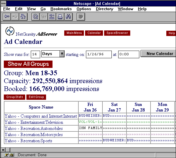 NetGravity (Сан-Матео, шт. Калифорния), начинающая компания - разработчик программных средств, выпустила новое серверное ПО, предоставляющее операторам Web возможности слежения, мониторинга и размещения онлайновой рекламы в World-Wide Web.