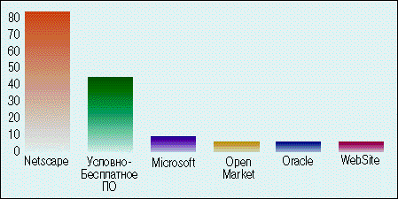 Дела серверные. А вот каково реальное положение дел и почему Forrester Research полагает, что Netscape станет стандартной программной платформой, хочет того Microsoft или нет. В исследовании, опубликованном в мае, фирма Forrester Research обнаружила, что ПО сервера Netscape было выбрано 80% профессиональных менеджеров Web-узлов - эта сила заставляет и других переходить от условно-бесплатного ПО к коммерческим пакетам. По прогнозу Forrester, к 1998 г. Netscape "станет ведущим поставщиком Web-серверов".