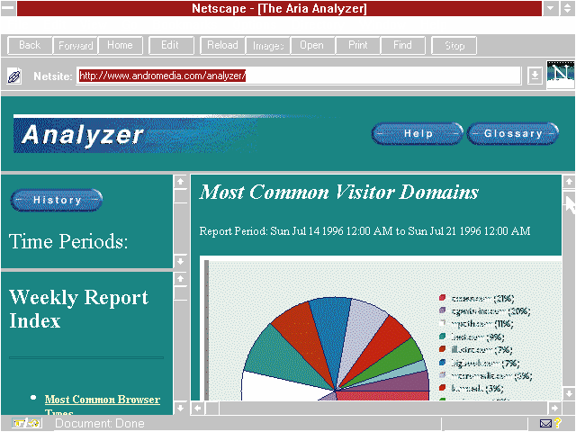 Фирма Andromedia (Сан-Франциско, шт. Калифорния) выпустила в августе пакет Aria WWW Recording and Reporting Systems, позволяющий администраторам узлов собирать детальную информацию о деятельности их Web-серверов и предоставлять статистические данные.