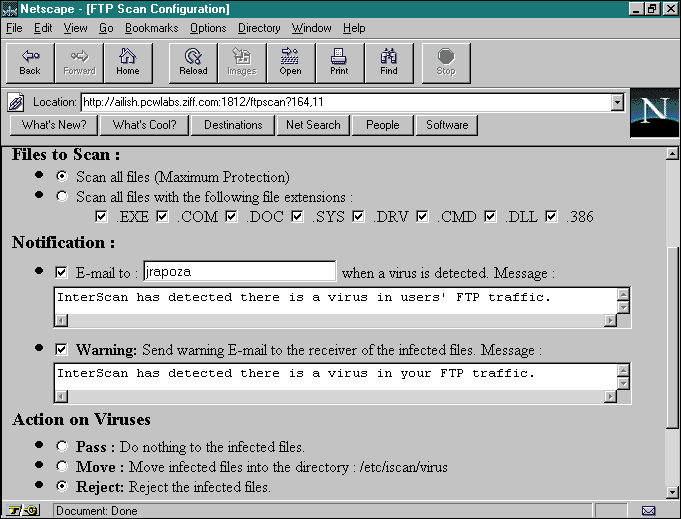 Дистанционное безопасное управление и тем и другим продуктом производится с помощью программы просмотра серверов "Всемирной паутины". InterScan E-Mail VirusWall, кроме того, оснащен очень простым в использовании административным интерфейсом Windows NT.