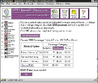 Проект использования корпоративной сети вырос из дискеты с программой моделирования, которую LDS ранее подготовила для AT&T, с тем чтобы служащие могли рассмотреть различные варианты медицинского страхования, прежде чем обращаться к специалисту по пособиям. Одна из задач внедрения корпоративной сети заключалась в дальнейшем упрощении процесса выбора. Подключение сети к базе данных, содержащей сведения о сотрудниках, позволило настроить прикладные программы на индивидуальную работу с каждым служащим. Даже раздел "Ответы на наиболее типичные вопросы" удалось менять в зависимости от того, например, имеются ли у данного служащего дети, которые нуждаются в страховке.