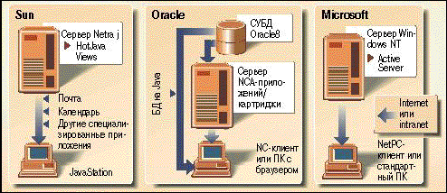 Корпорации Oracle (Редвуд-Шорз, шт. Калифорния) и Microsoft (Редмонд, шт. Вашингтон) наступают на пятки фирме Sun Microsystems, которая выпустила сетевой компьютер JavaStation в конце октября: уже в ноябре они представили свои аппаратные средства для распределенных вычислений.