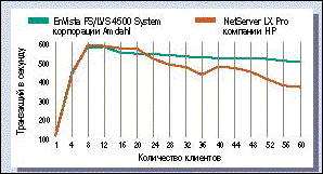 Для оценки способности EnVista FS/LVS 4500 обслуживать приложения был использован эталонный тест ServerBench 3.0 фирмы Ziff-Davis Operation. Система входила в испытательную сеть, состоящую из 60 узлов, разделенную на четыре сетевых сегмента по 15 клиентов в каждом; скорость передачи данных в сегментах составляла 10 Мбит/с. Подключение этой сети к серверу EnVista FS производилось с использованием Windows 95 и средств организации TCP/IP-сетей корпорации Microsoft.