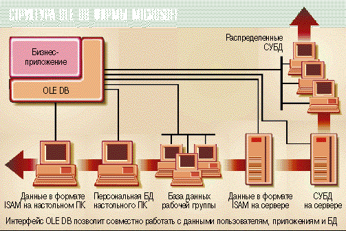 В то время как корпорация Oracle, фирмы Informix Software и IBM добавляют в механизмы своих реляционных СУБД возможности работы с объектами, Microsoft видит для себя задачу в том, чтобы обеспечить изобилие с помощью OLE DB - прикладного интерфейса (API), содержащего правила для доступа и управления реляционными данными, неструктурированными файлами и изображениями.
