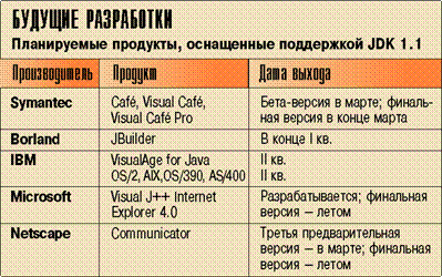 Сражение за JNI не отпугнуло других производителей инструментов и Java-приложений. Корпорация Symantec (Купертино, шт. Калифорния) выпустит несколько новых инструментов и модернизированные версии старых, поддерживающие JDK 1.1. В марте начнется бета-тестирование Cafe, Visual Cafe и Visual Cafe Pro, оснащенных поддержкой JDK 1.1. Начало их поставок намечено на конец I квартала. В этом же квартале фирма Borland International (Скотс-Вэйли, шт. Калифорния) впервые представит бета-версию JBuilder, поддерживающую JDK 1.1. IBM предполагает выпустить финальную версию VisualAge for Java с поддержкой JDK 1.1 во II квартале.