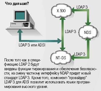 После того как в спецификацию LDAP 2 будут введены функции тиражирования и обеспечения безопасности, на смену частному интерфейсу NDAP придет новый стандарт LDAP 3. Кроме того, компонент-“провайдер” LDAP 3 для ADSI позволит использовать языки программирования высокого уровня.