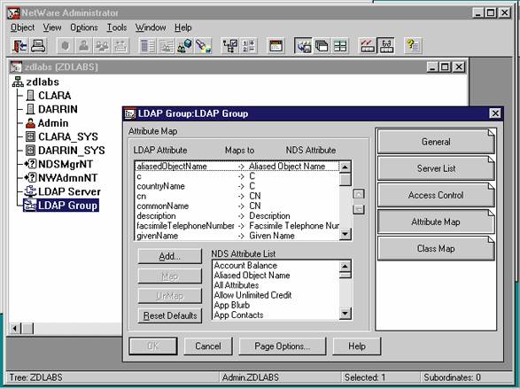 Завершив конфигурирование, мы запустили утилиту NWADMIN и просмотрели новые объекты LDAP Group и LDAP Server, появившиеся на схеме NDS. Они позволяют очень точно определять, какие атрибуты каталога можно раскрывать для каждого конкретного клиента.
