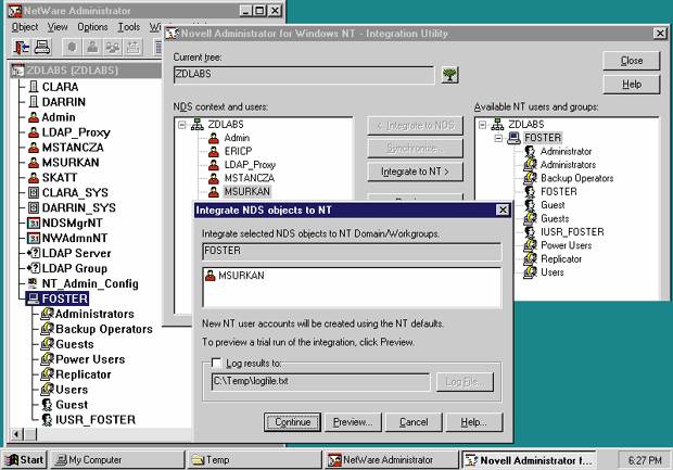 С помощью NA4NT мы смогли просмотреть в дереве NDS домен Windows NT Domain Foster (1), воспользоваться утилитой Integration Utility для перемещения ресурсов некоторых пользователей и серверов из NT в NDS (2) и интегрировать пользовательские объекты поодиночке или все сразу, отображая результаты в файле учета перемещений (3)