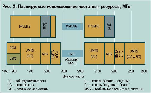 Глобальный по охвату географических регионов и долгосрочный по этапам реализации проект FPLMTS (Future Public Land Mobile Telecommunication System) осуществлен Международным союзом электросвязи (ITU). На всемирной конференции ITU по радиочастотам (WARC-92) для FPLMTS были выделены соответствующие частотные диапазоны (рис. 3). В настоящее время рабочие группы Европейского института стандартизации связи (ETSI) SMG5 (проект UMTS) и ITU-R (проект IMT-2000/FPLMTS) ведут свою работу параллельно и в определенной степени скоординированно. Рекомендации ITU и стандарты ETSI будут согласованно определять такие аспекты построения UMTS/IMT-2000 как архитектура, функциональные характеристики, радиочастотные диапазоны, доступ к спутниковым системам. Также планируется прийти к общим техническим решениям в области кодирования речи, изображений и видеоинформации, передаче данных и сигнализации при межсетевых взаимодействиях. Стандарты UMTS будут более детально определять интерфейсы и взаимодействие с создаваемыми в Европе системами радиосвязи GSM, DECT, TETRA и HIPERLAN. Подобным образом с глобальными рекомендациями ITU по системе IMT-2000/FPLMTS будут сочетаться концепции новых мобильных систем, объявленные в США, Японии и Южной Корее.