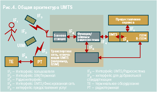 Пользователь UMTS сможет гибко управлять как традиционными службами связи, так и многими новыми режимами обмена информацией. В их числе: прием электронных новостей, видеоконференции, музыка CD-качества, мобильный доступ к базам данных и Web-серверам, электронные заказы и покупки, компьютерные развлечения и т. п. Архитектура UMTS должна обеспечить как высокую производительность для всех режимов, так и глобально унифицированный сервис, широковещательный прием, а кроме того, предоставлять поисковые возможности для выбора доступных ресурсов и удобные средства выхода в Internet. Архитектура UMTS строится на основе четкого разделения функций сервис-провайдера, оператора сети, подписчика и пользователя. Разделение архитектурных элементов и выполняемых ими функций позволяет реализовывать новые услуги без дополнительных инвестиций в аппаратуру сервис-провайдеров. Подписчиком может быть как отдельный пользователь, так и коллективный клиент, объединяющий пользователей из одной семьи или фирмы. Общая архитектура UMTS, схематично показанная на рис. 4, разрабатывается с учетом данных требований и имеет четкую спецификацию всех межсистемных и радиоинтерфейсов.