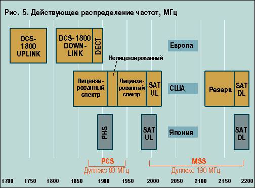 Всемирная радиоконференция (The 1992 World Administration Radio Conference - WARC’92), проведенная ITU, выделила 230 МГц в диапазоне 2 ГГц, включая наземный и спутниковый сегменты для использования FPLMTS/IMT-2000 в мировом масштабе. Это решение, показанное в схеме на рис. 4, было поддержано европейскими организациями по стандартизации, где соответствующий диапазон 230 МГц зарезервирован для UMTS. Если сравнить планируемое распределение частотных ресурсов с действующим (рис. 5), то видно, что в Европе диапазоны частот для DECT и UMTS частично совпадают. В США подобные совпадения еще более усложняют ситуацию. В связи с недостаточным объемом имеющихся частотных ресурсов UMTS должна проектироваться с учетом оптимального и гибкого использования радиочастотных диапазонов.