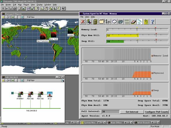 Щелкнув на любом устройстве, мы могли получить полную SNMP-информацию о его функционировании, управлять им в реальном масштабе времени, а также просматривать графики или таблицы статистической информации, отображающие те или иные параметры системы. Детализация данных, получаемых с серверов и клиентских компьютеров, значительно возросла после установки агентов TNG.