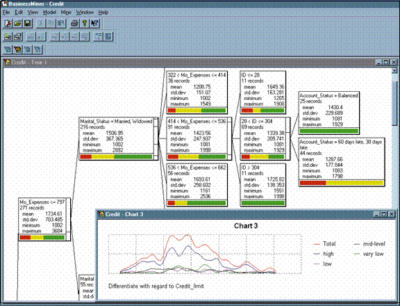 В BusinessMiner, по сравнению со Scenario, экраны анализа данных менее содержательны. Хотя для заданного входного набора программа и позволяет сегментировать данные и строить дерево факторов, в ней нет такого же представления для визуализации данных или для просмотра таблиц с выборками, как в Scenario. В BusinessMiner нет также процедур статистической проверки и балансировки дерева факторов, например, мы “спокойно” могли заняться анализом ветки с данными, не имеющими статистической значимости.
