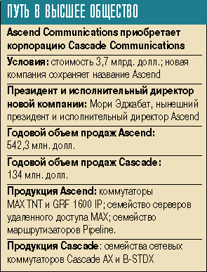 “Ascend работает над маршрутизаторами, но они пока не удовлетворяют требованиям рынка высокопроизводительных устройств, - отметила Виржиния Брукс, специалист фирмы Aberdeen Group (Бостон). - Сложно сказать, будут ли инженеры компании развивать технологию маршрутизации или изберут альтернативную ей технологию коммутации. Одно неоспоримо: они получили мощный импульс, которого у них раньше не было”.