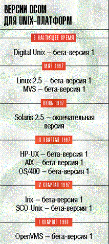 Тем не менее график выпуска большинства продуктов задерживается всего лишь на квартал. “Честно говоря, мы только год назад выпустили окончательную версию DCOM для Windows, вместе с Windows NT 4.0”, - заявил вице-президент Microsoft Боб Мулья.