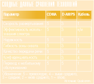 С научной точки зрения наиболее обстоятельный доклад на конференции РАПС сделала Сюзан Е. Шедель, специалист по финансовым вопросам компании Qualcomm (www.qualcomm.com). Ее выступление было посвящено экономическому анализу сетей абонентского доступа на базе сравнения трех технологий: CDMA (Code Division Multiple Access - многостанционный доступ с кодовым разделением каналов), цифрового сотового стандарта D-AMPS (Advanced Mobil Phone Service - усовершенствованная подвижная телефонная служба) и кабельных сетей, используемых в России (на примере Нижнего Новгорода). При этом г-жа Шедель пришла к весьма любопытным результатам. По ее мнению, капиталовложения в CDMA на 54% меньше, чем в кабельную систему, и на 82% меньше, чем в структуру D-AMPS. Затраты на эксплуатацию сети с CDMA ниже соответственно на 38 и 50%. Сводные данные сравнения технологий приведены в таблице. При этом следует учесть, что CDMA развертывается в 20 раз быстрее, чем кабельная сеть и требует значительно меньше базовых станций по сравнению с D-AMPS и т. д.